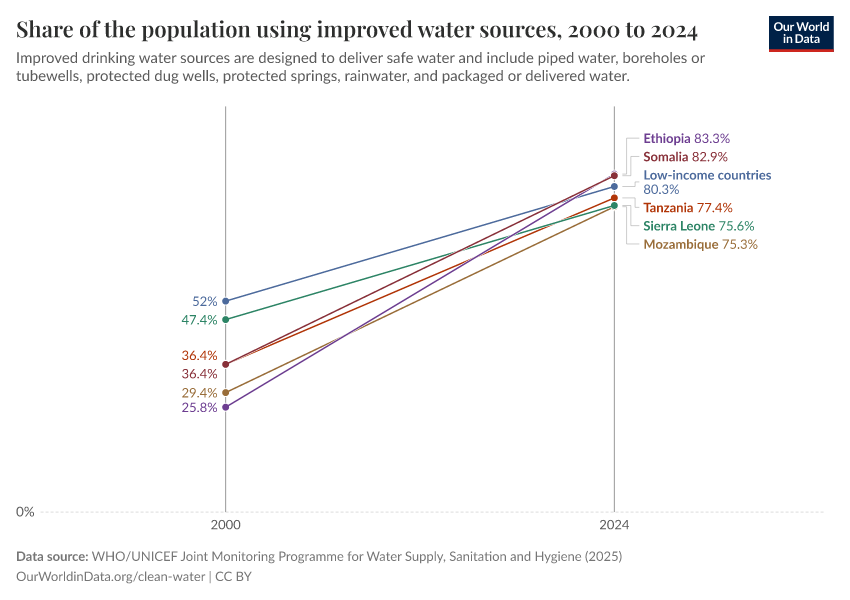 Many countries have rapidly increased this share in the last few decades. In the slope chart, you can see the change in the share of the population with improved water for a selection of countries that still had pretty poor coverage in 2000. In Ethiopia, for example, access has tripled from just 26% to 80%.